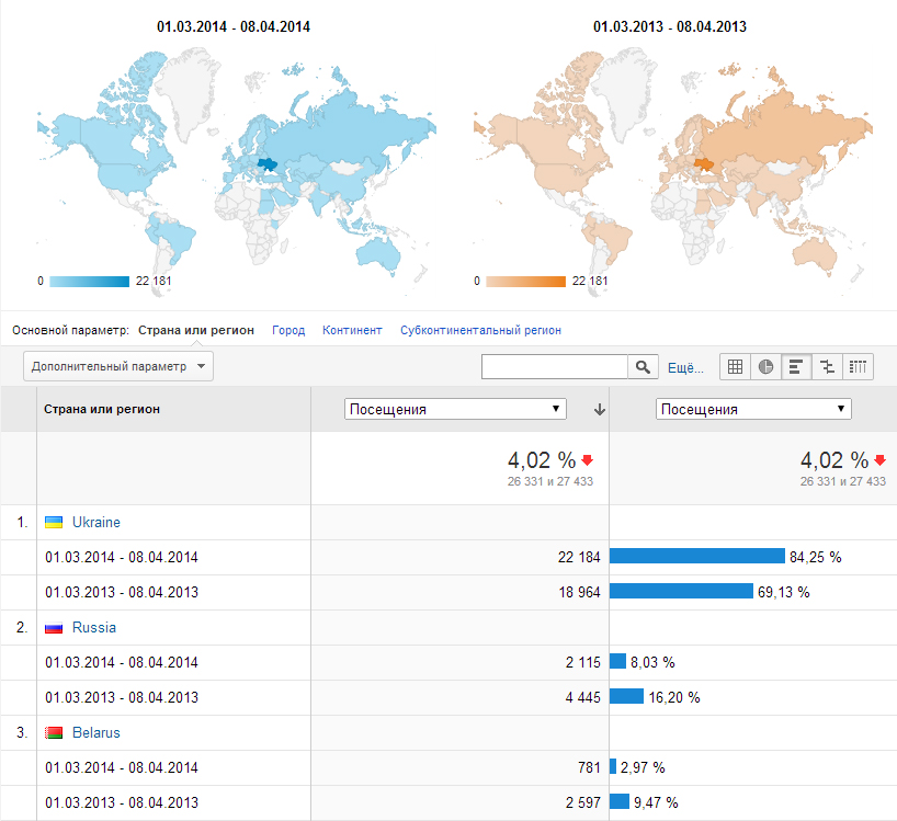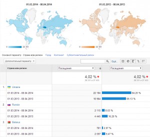Также, на основе статистики портала MORE.KS.UA были представлены данные об изменениях интереса к Херсонщине в сравнении с аналогичным периодом прошлого года. По количественным показателям аудитория практически не изменилась. За март месяц портал о туризме на Херсонщине посетило те же 27 тысяч человек, как и в марте 2013. При этом количество россиян и белорусов уменьшилось вдвое, а жители Украины восполнили этот пробел.