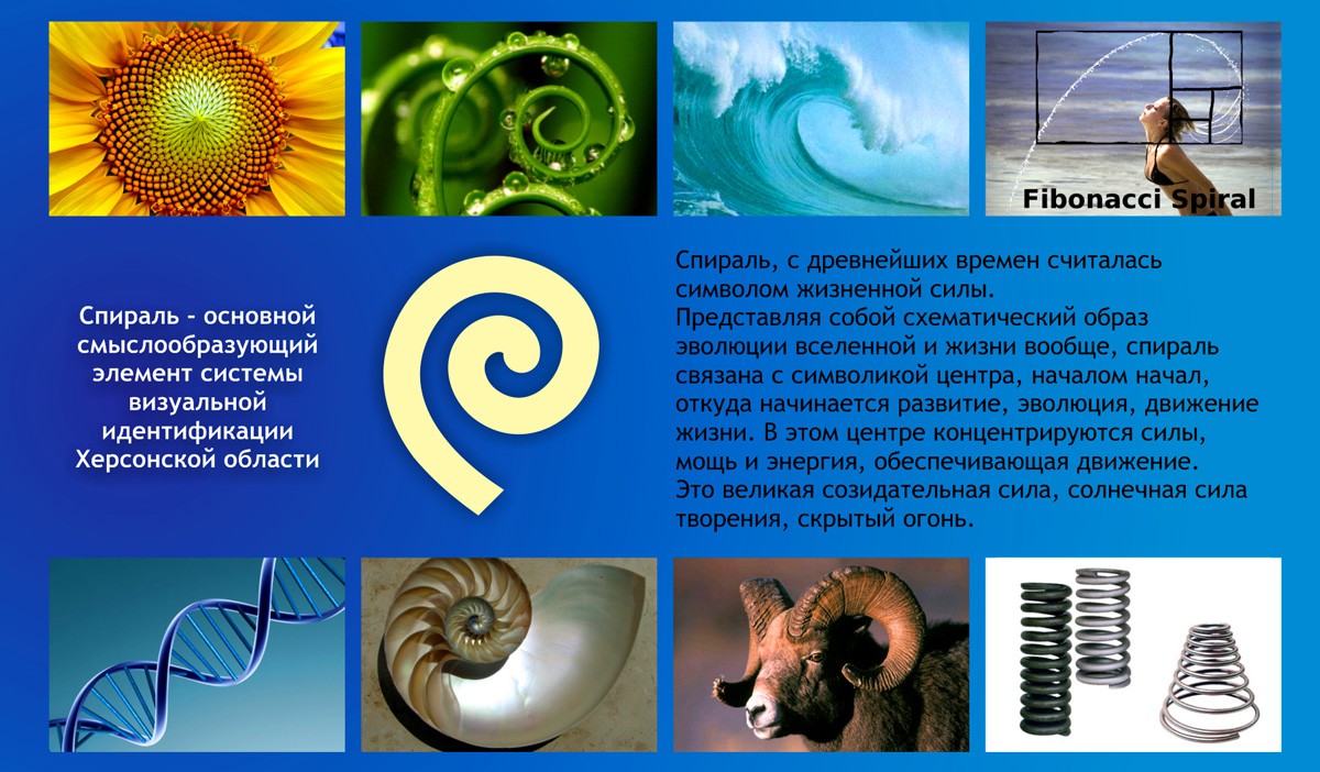 Ключевым смыслообразующим элементом знака является спираль, с древнейших времен являющаяся символом жизненной силы. Спираль представляет собой схематический образ эволюции вселенной и жизни вообще. Спираль связана с символикой центра, началом начал, откуда начинается развитие, эволюция, движение жизни. В этом центре концентрируются силы, мощь и энергия, обеспечивающая движение. Это великая созидательная сила, солнечная сила творения, скрытый огонь. Сочетая в себе форму круга и импульс движения, спираль является символом времени, цикличности, непрерывности существования. Как плавная бесконечная линия Спираль символизирует развитие, непрерывность, центростремительное и центробежное движение, ритм дыхания и самой жизни.